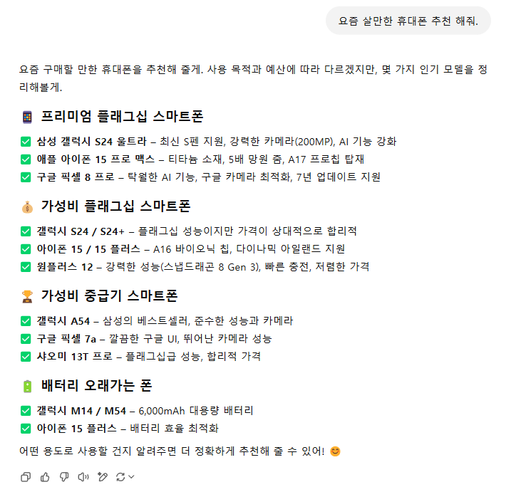 ➡️ 휴대폰을 구매하려 하는데, 나에게 맞는 휴대폰을 추천해 줘. 기존에는 아이폰을 사용했었고, 현재도 애플워치, 에어팟을 사용하고 있어서 연동이 되면 좋겠어. 가격은 120만 원 선에서 추천해 줘. (⭕)