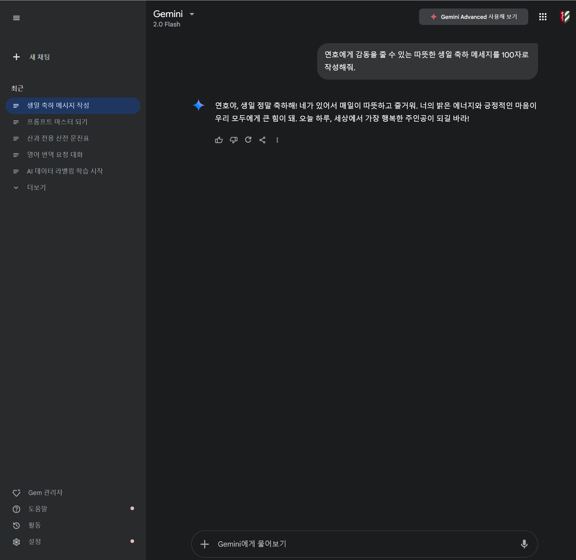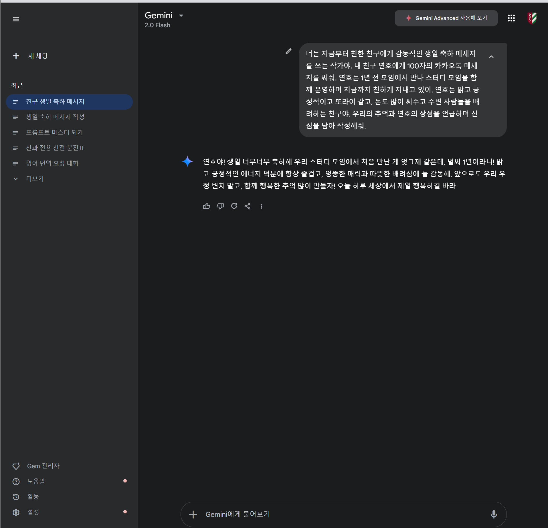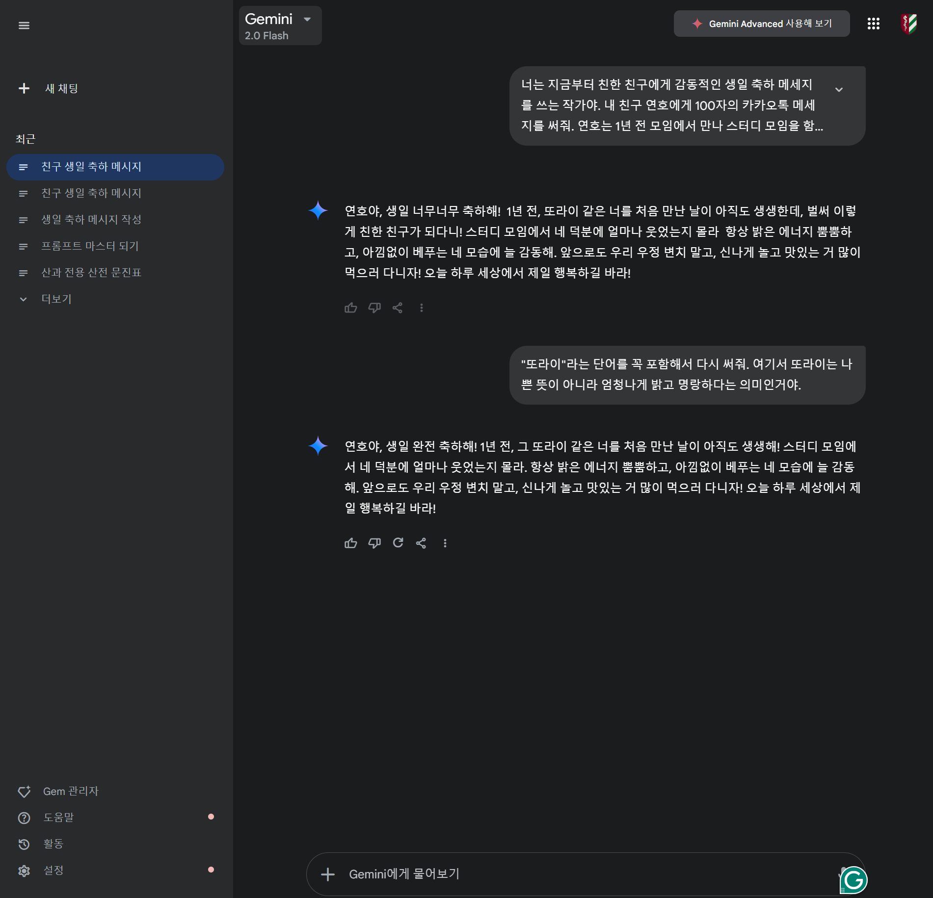 - AI 모델에게 "친한 친구에게 생일 축하 메시지를 대필하는 작가" 역할 부여