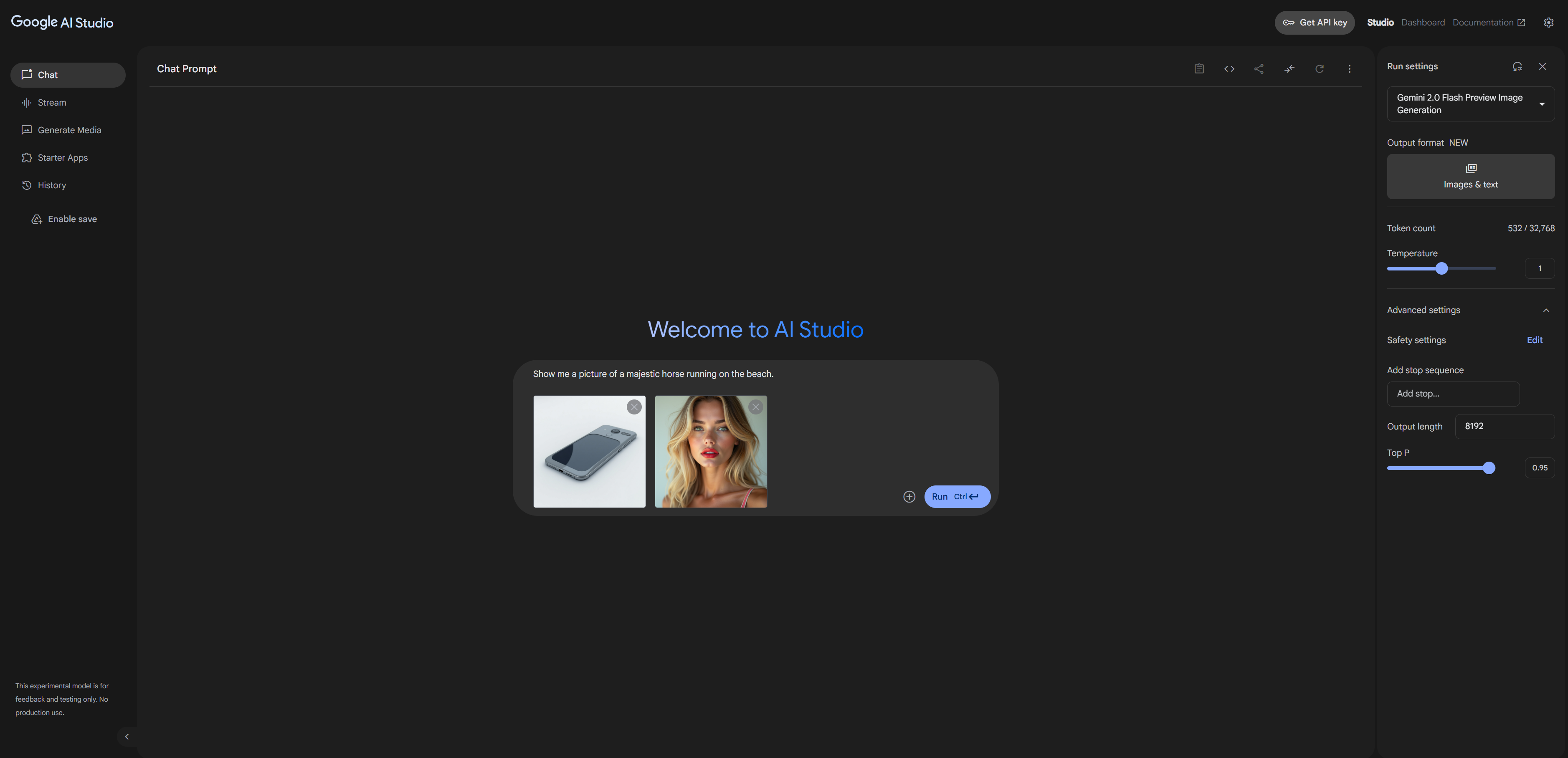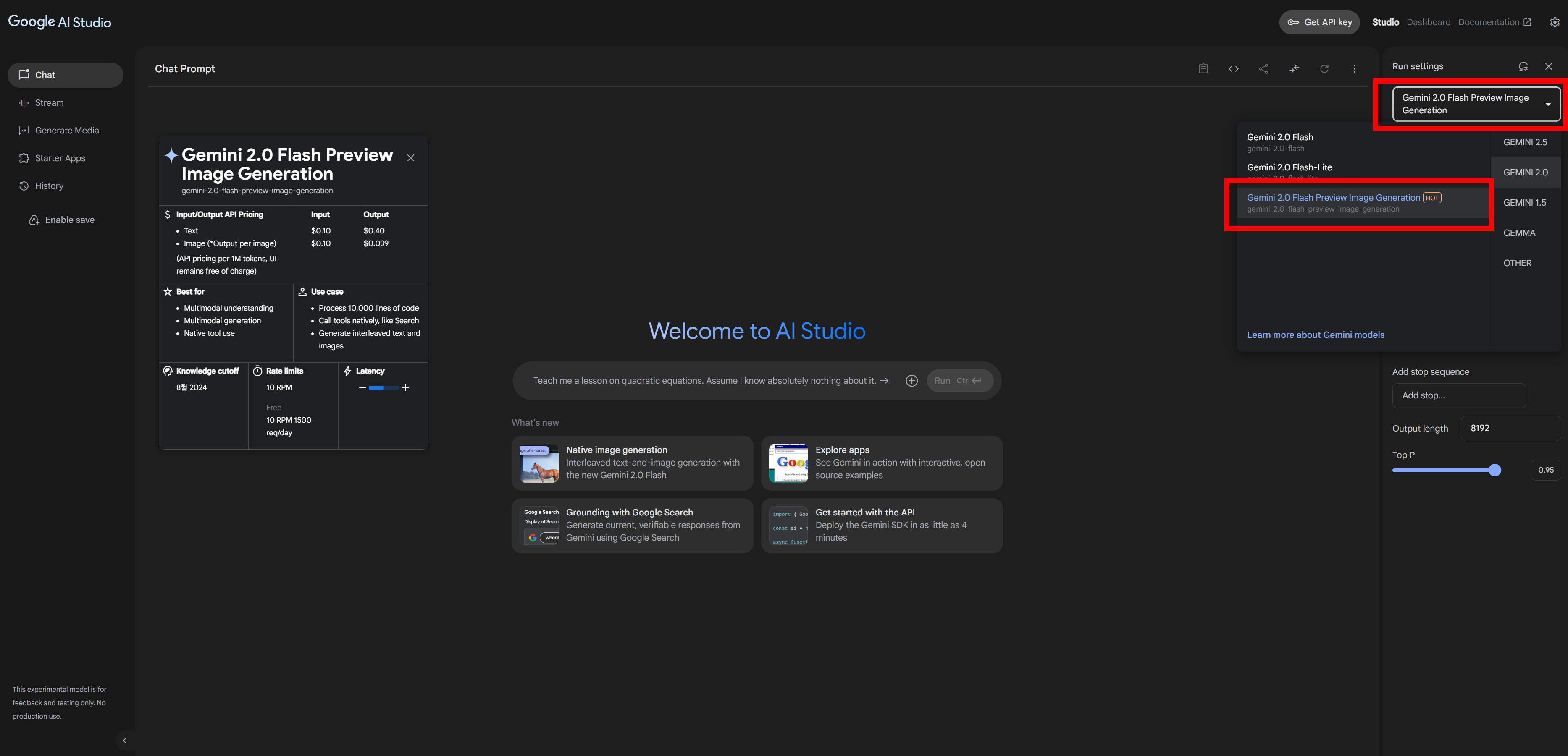 우선 구글 AI(Google AI)에 접속하여 오른쪽 Run settings에서 Gemini 2.0 Flash Preview Image Generation을 선택합니다.