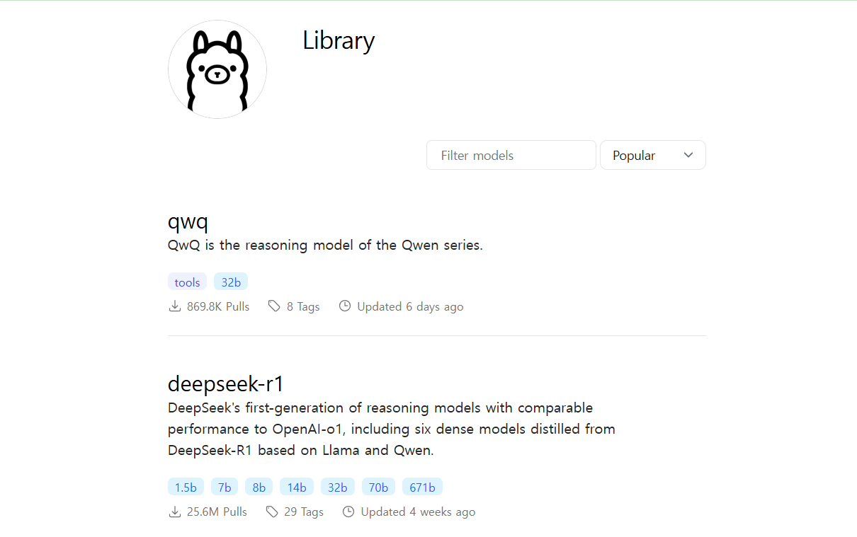 설치 가능한 라이브러리는 공식사이트(https://ollama.com/library)에서 확인할 수 있습니다.