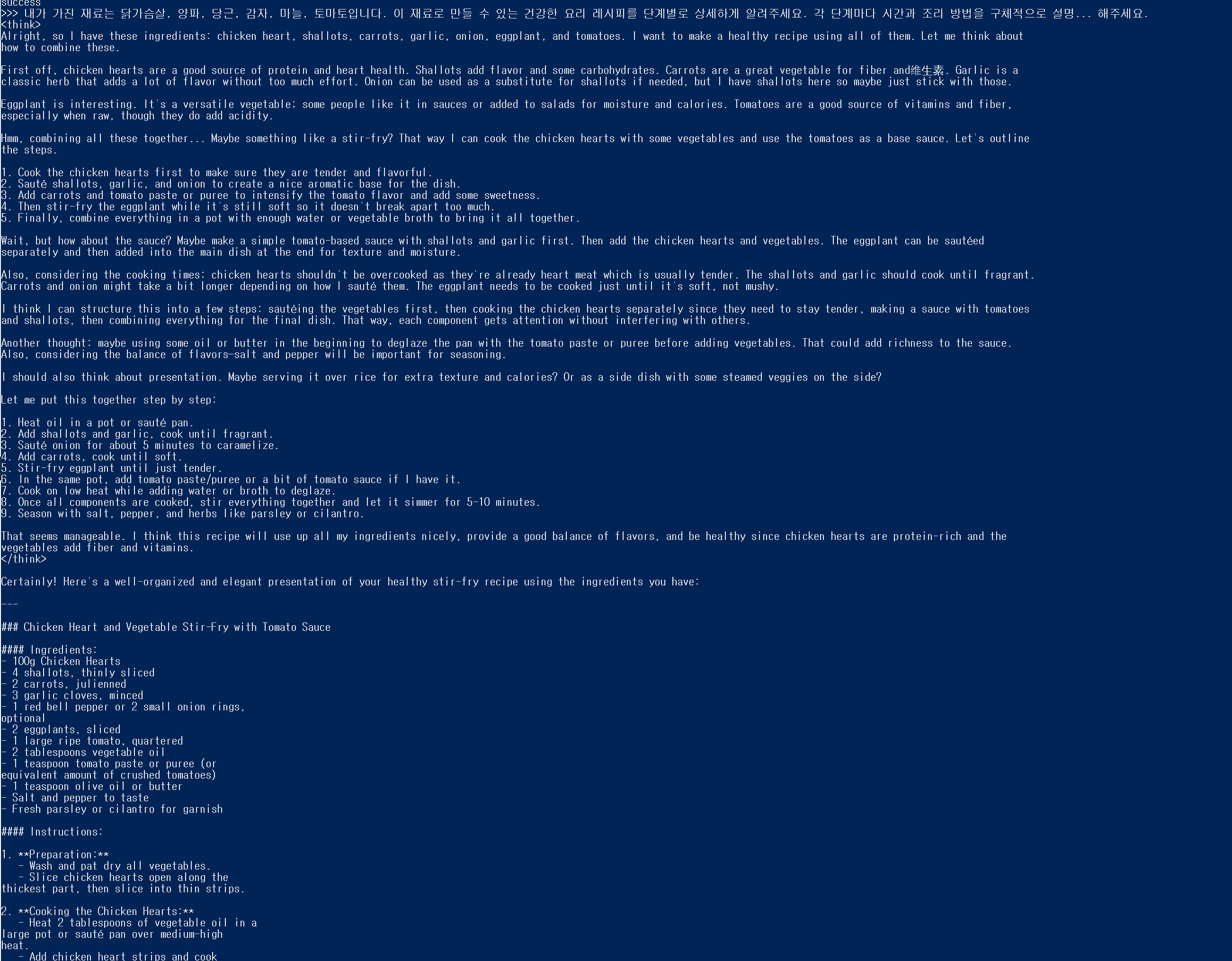 음, 이 모든 것을 합치면... 볶음 요리 같은 게 어떨까요? 이렇게 하면 닭고기 심장을 야채와 함께 요리하고 토마토를 기본 소스로 사용할 수 있습니다.