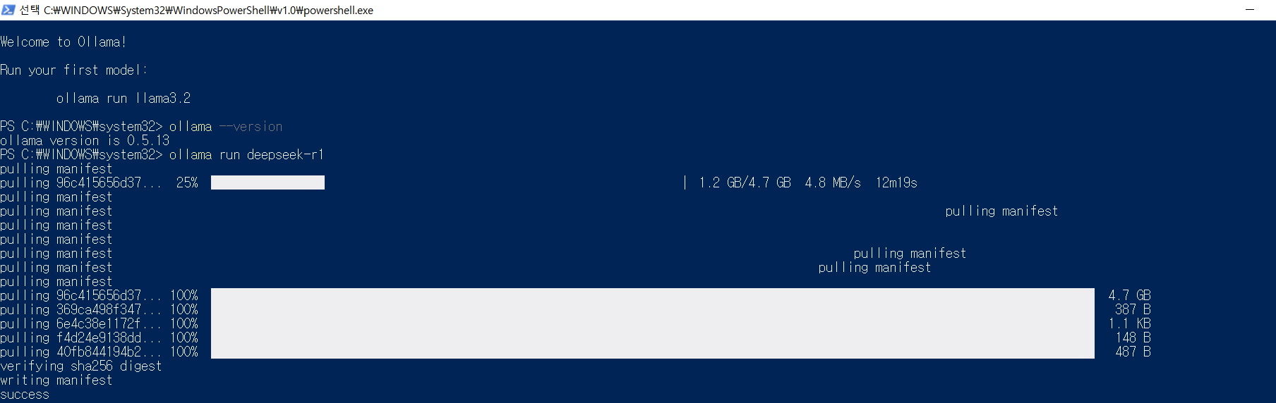 다운로드가 완료되면 vertfing 이라는 메세지가 출력되고 그 이후에 success가 마지막으로 나오면 다운로드가 종료된 상태입니다.