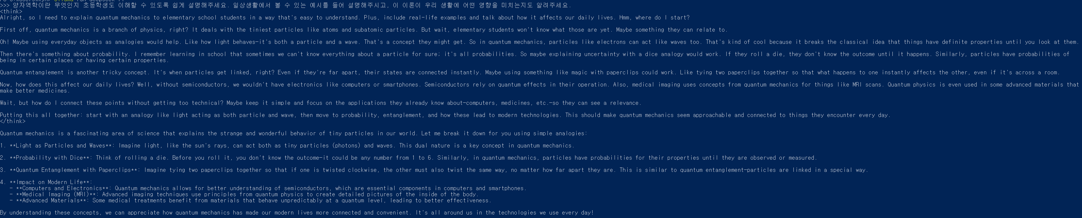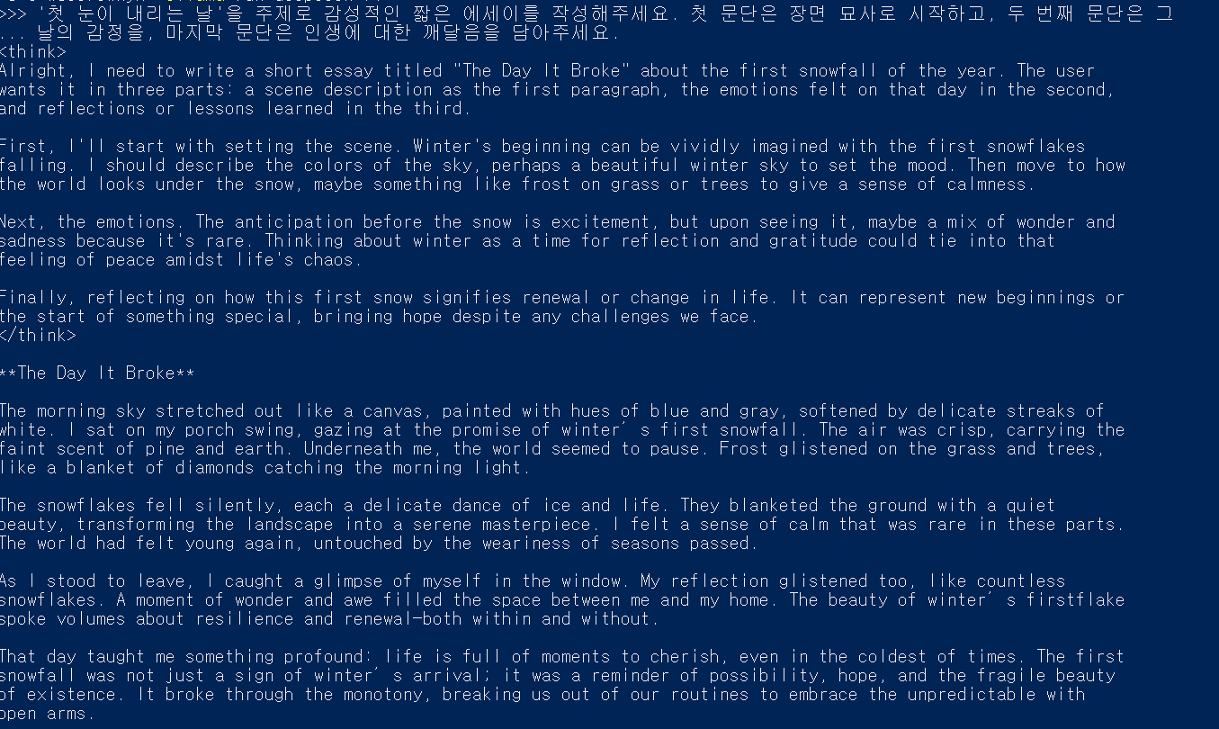 모델 다운로드가 완료되면, 자동으로 모델이 실행되고 채팅 인터페이스가 나타납니다.
