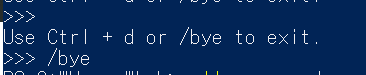 프롬프트에서 /bye를 입력하거나, Ctrl + D를 누르면 Ollama가 종료됩니다.