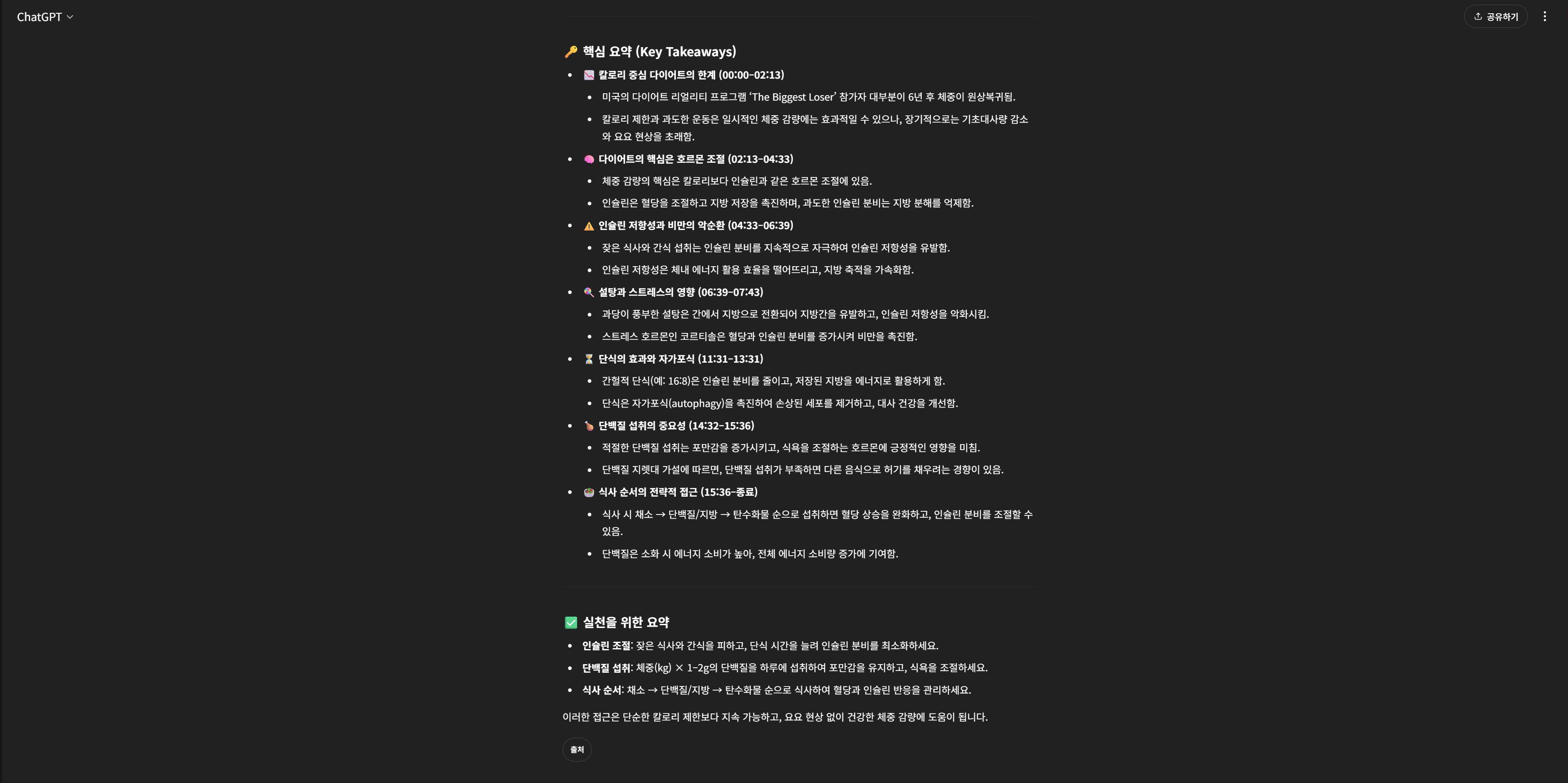 이렇게 16분 13초 분량의 유튜브 영상이 1분 만에 읽을 수 있도록 핵심만 파악하여 정리해 줍니다.
