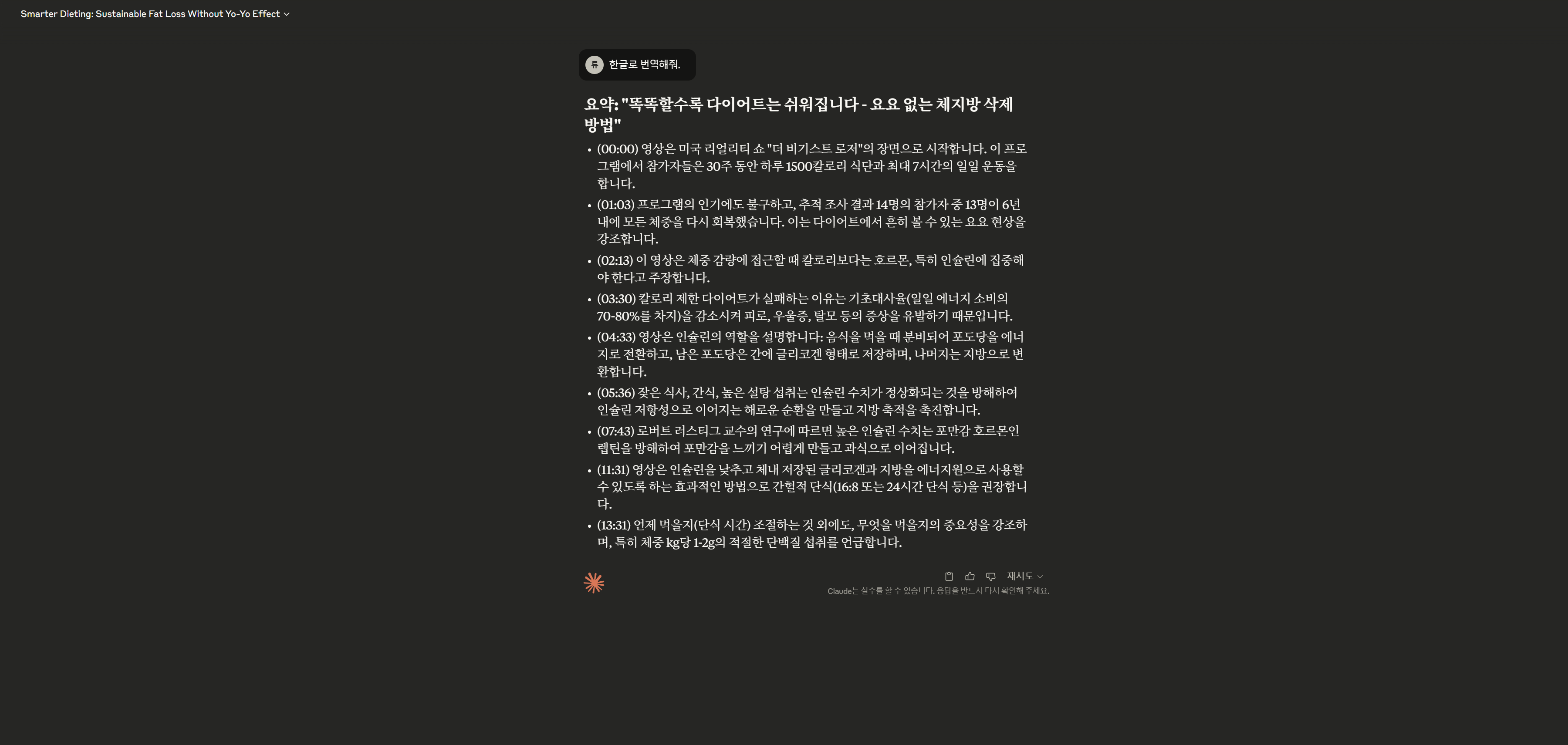 클로드(Claude) 또한, 유튜브의 내용을 짧고 핵심만 요약하여 핵심 내용을 파악하기 쉽게 해 주었습니다.