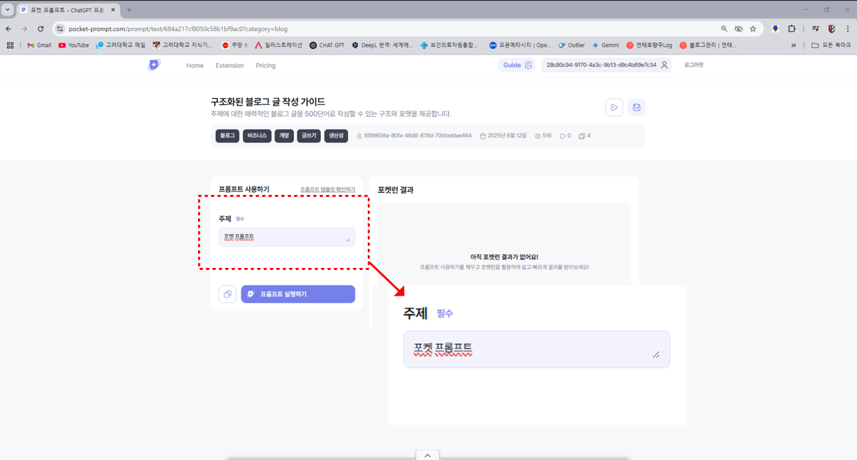 저는 포켓 프롬프트를 작성하는 글을 보고 싶어서 「주제」에 ‘포켓 프롬프트’를 입력하였습니다.