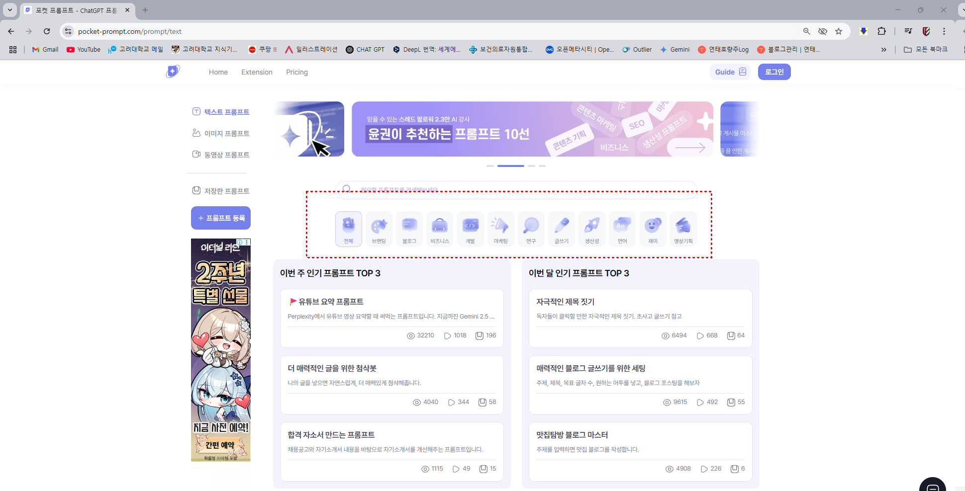 포켓 프롬프트 홈페이지에 접속하여 프롬프트 카테고리를 선택합니다.