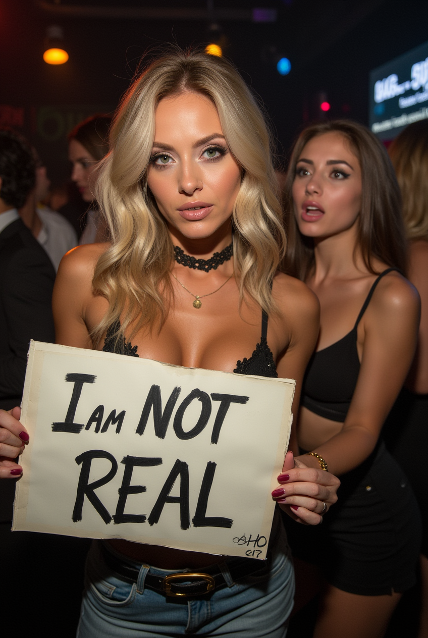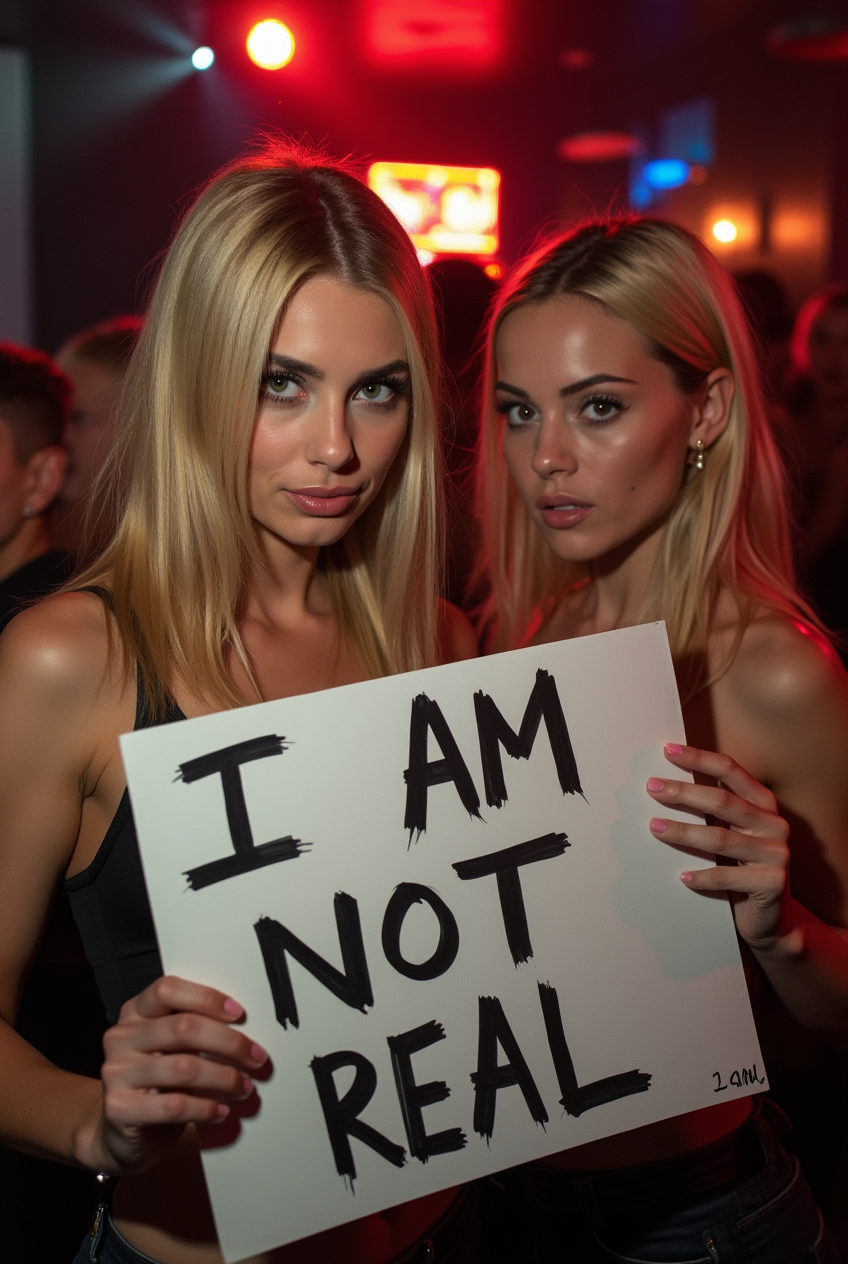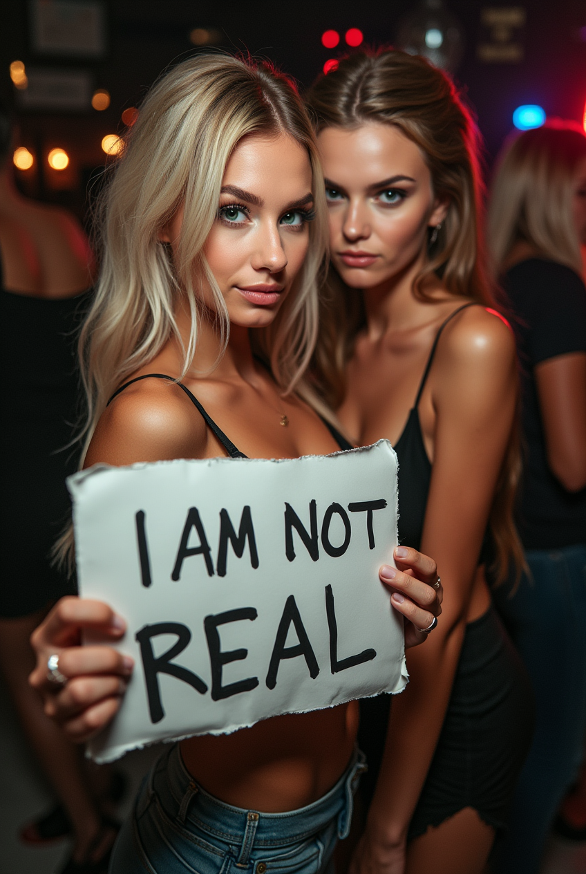 A beautiful woman with blonde hair and green eyes is posing for a photo in a club, holding a handwritten sign that says “I AM NOT REAL.” Next to her, another woman is looking at her with a shocked expression. The photo is taken with a DSLR camera, and the flash is visibly reflected in the scene.