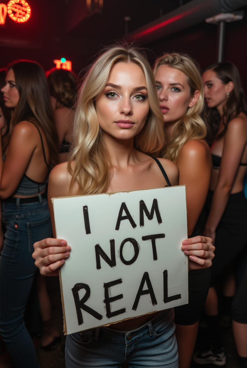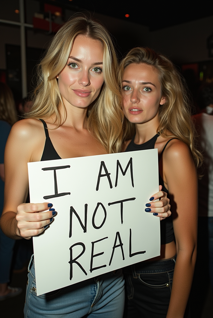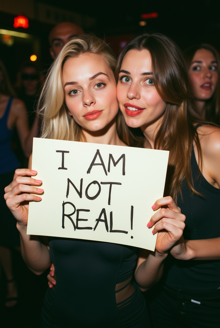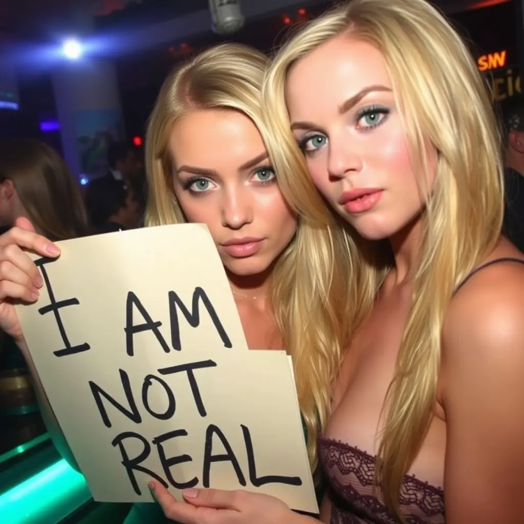 A beautiful woman with blonde hair and green eyes is posing for a photo in a club, holding a handwritten sign that says “I AM NOT REAL.” Next to her, another woman is looking at her with a shocked expression. The photo is taken with a DSLR camera, and the flash is visibly reflected in the scene.