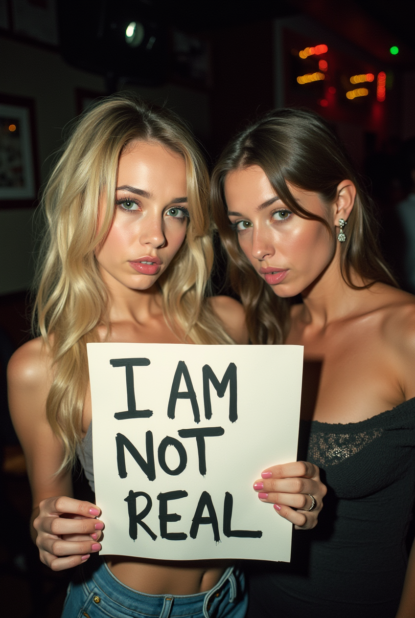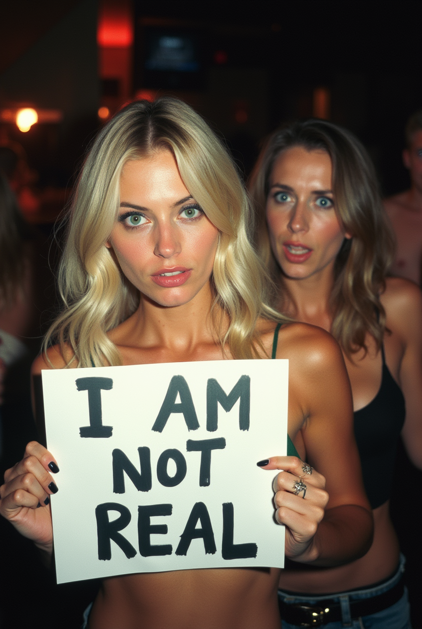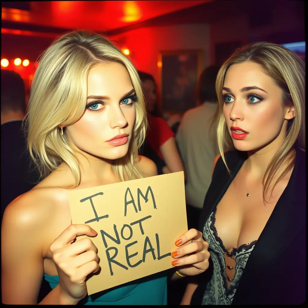 A beautiful woman with blonde hair and green eyes is posing for a photo in a club, holding a handwritten sign that says “I AM NOT REAL.” Next to her, another woman is looking at her with a shocked expression. The photo is taken with a flim camera, and the flash is visibly reflected in the scene.