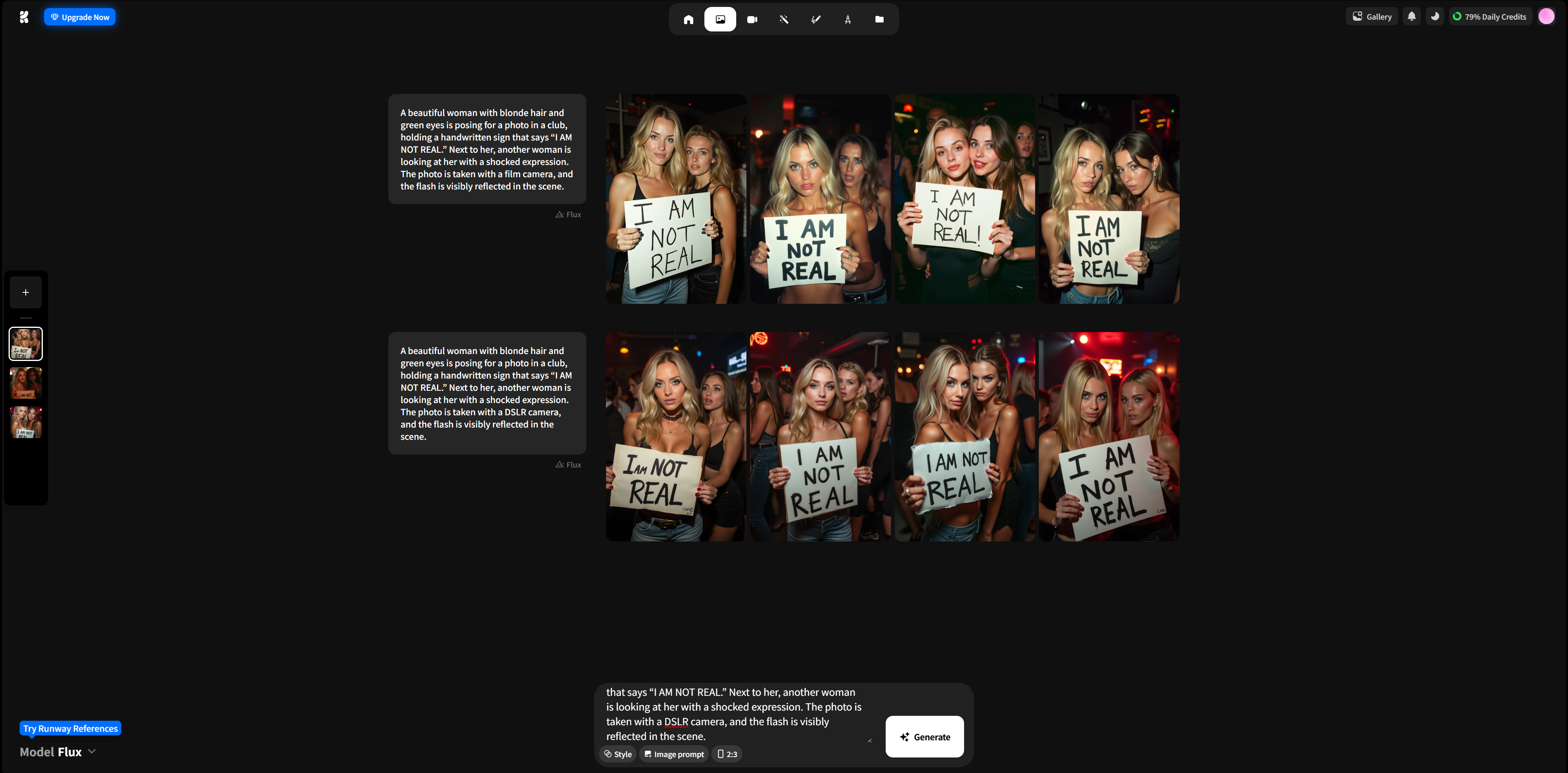 왼쪽) A beautiful woman with blonde hair and green eyes is posing for a photo in a club, holding a handwritten sign that says “I AM NOT REAL.” Next to her, another woman is looking at her with a shocked expression. The photo is taken with a flim camera, and the flash is visibly reflected in the scene.