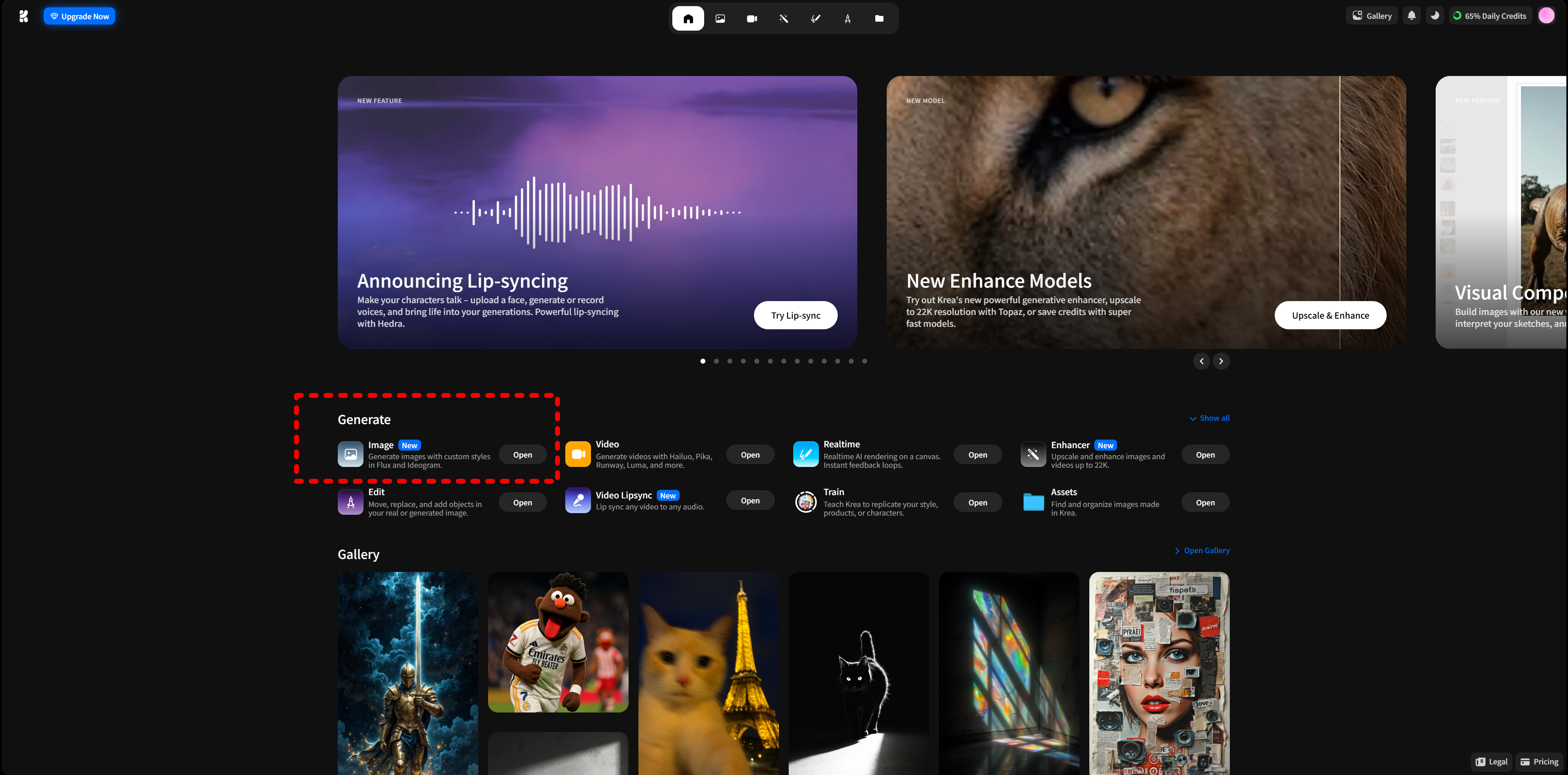 우선 KREA를 검색하여 접속한 다음, 메인 화면에서 Generate의 Image를 누릅니다.