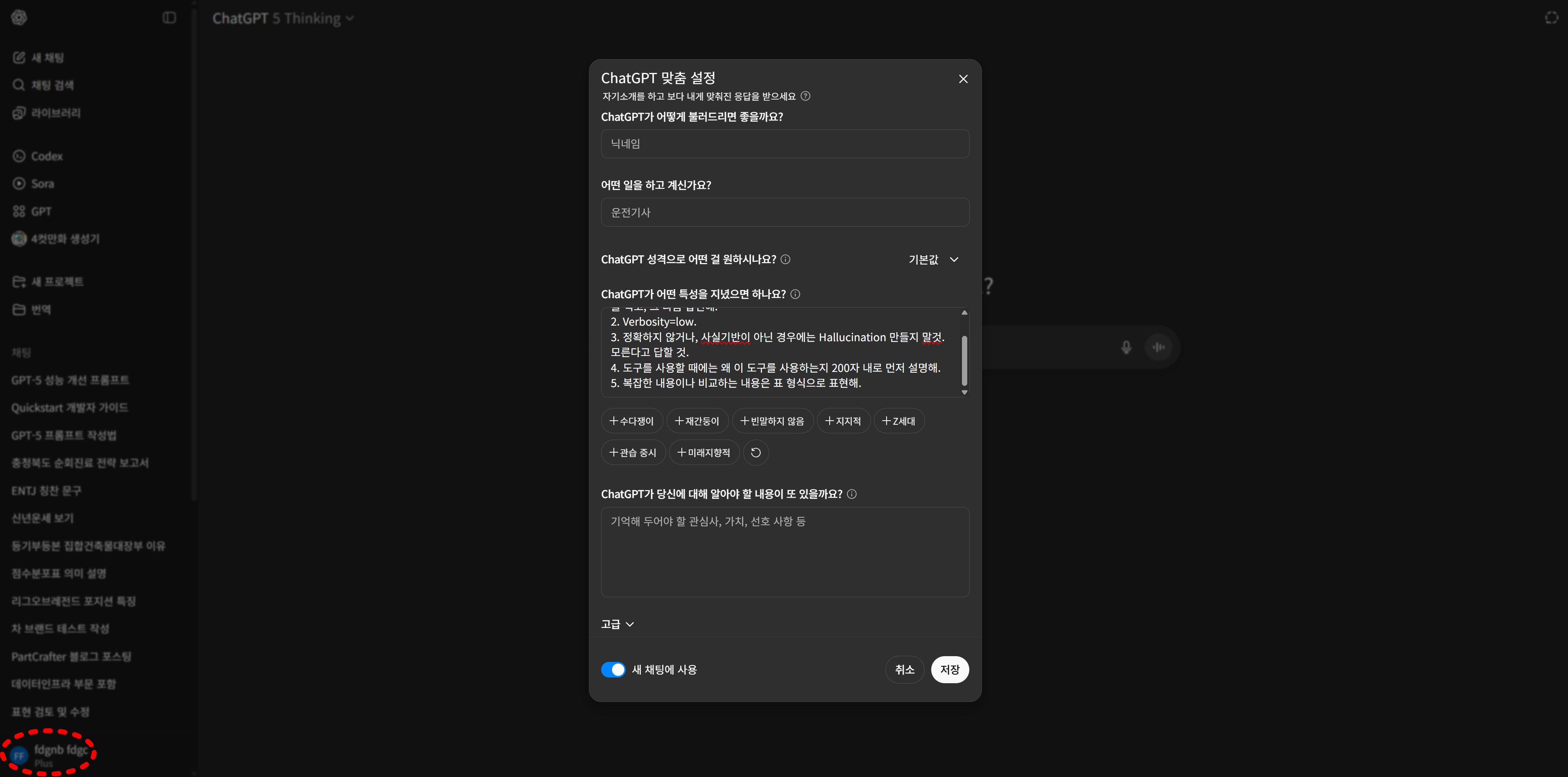 제가 알려드린 세팅과 프롬프트만 사용해도 GPT-5가 멍청해졌다는 체감은 확 줄고 천재모드로 바뀌었다는 생각이 들 겁니다.