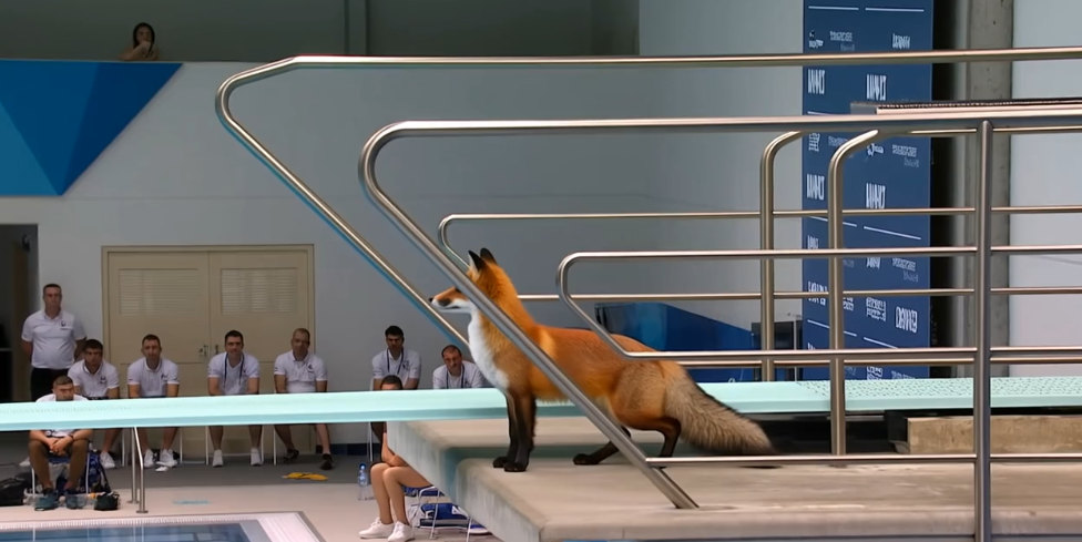 2. Televised footage of a [동물이름] performing an acrobatic dive—with flips and spins—from the 10 m Olympic platform into the pool.