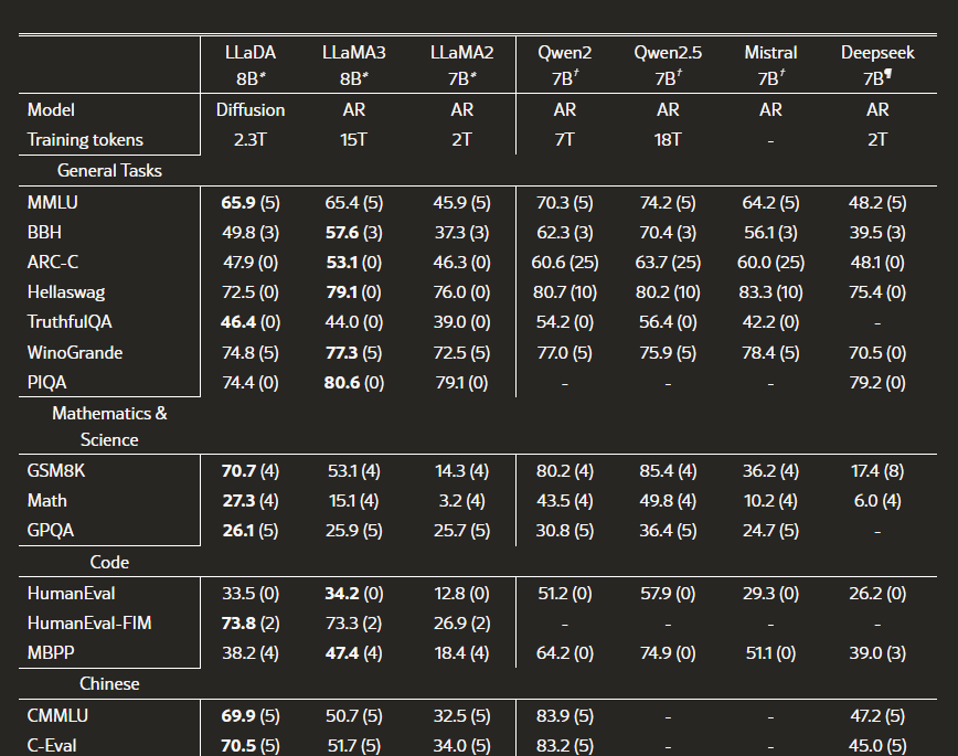 벤치마크 성능에 따르면 LLaDA는 타사 LLM과 비교해도 우수한 성능을 보여주고있습니다. 특히 Instruction Following 즉, 프롬프트를 얼마나 이해하고 응답하느냐에 대한 능력에서 유의미한 성능을 보여주고있습니다.