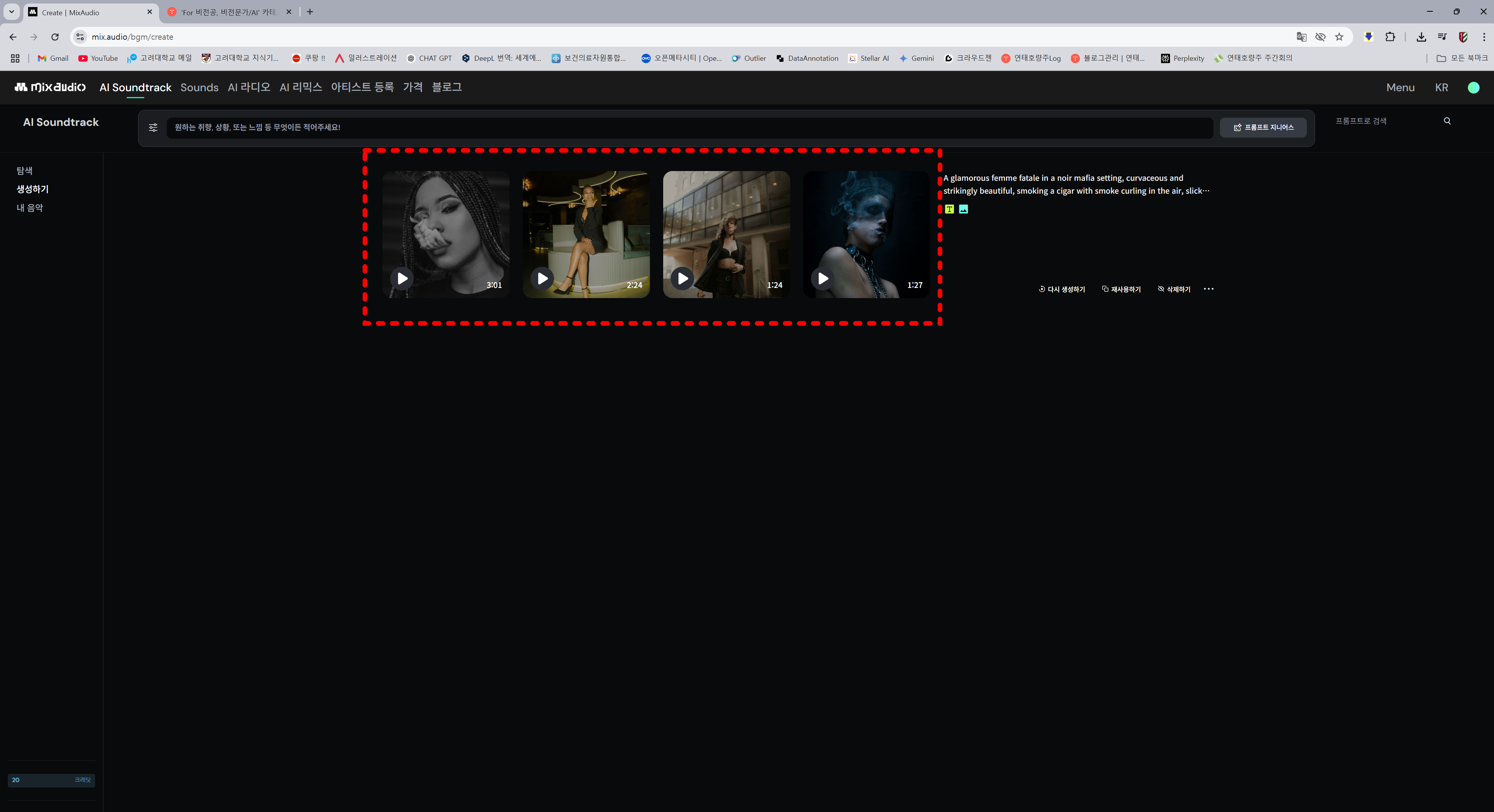 프롬프트와 이미지를 업로드한 뒤, 음악 생성하기를 누르면 4곡이 생성이 됩니다.
