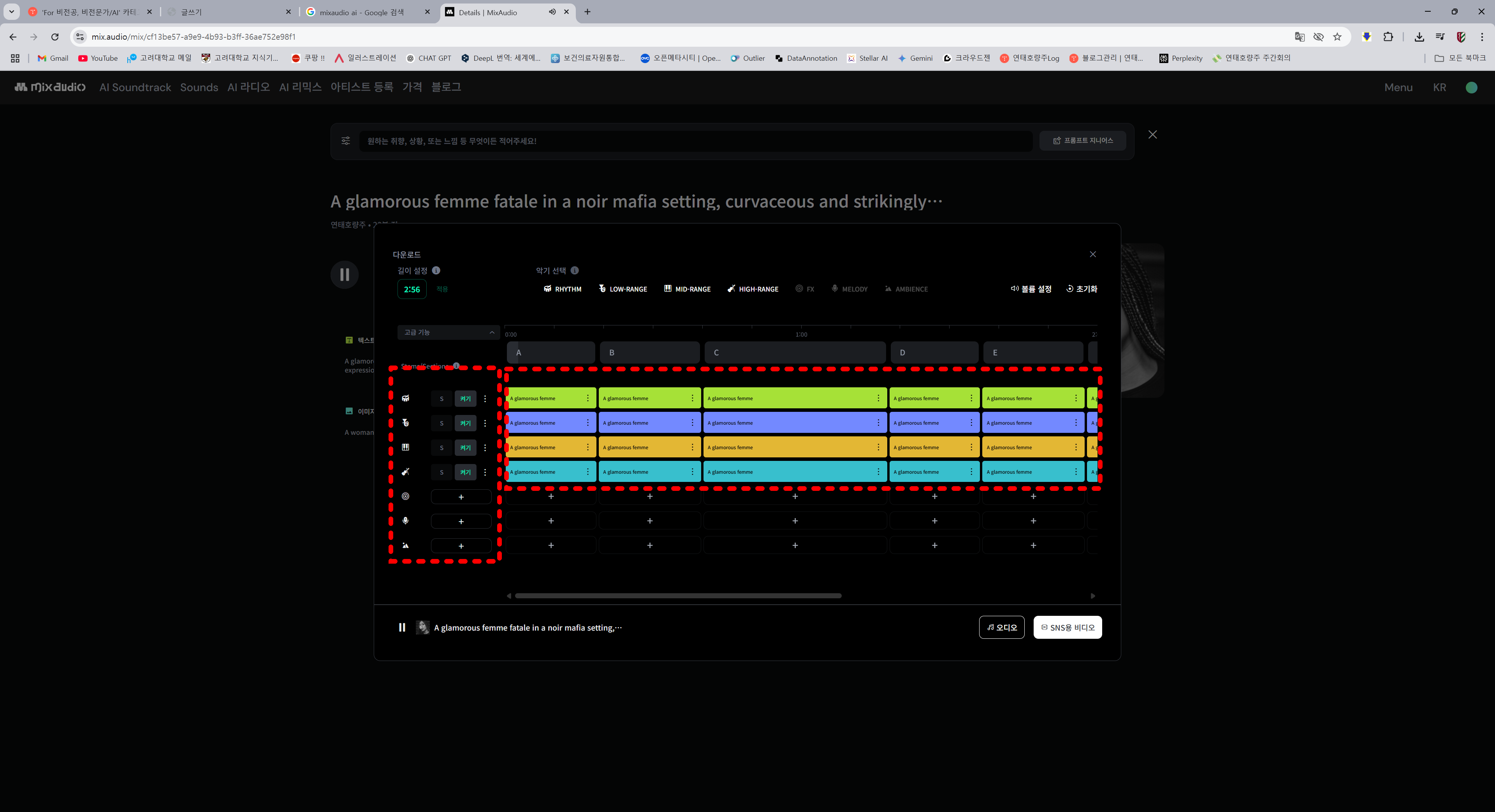 생성된 음악은 편집을 할 수 있습니다. 구간 마다 원하는 느낌으로 수정할 수 있으며, 악기를 끄고 키는 게 자유롭습니다.