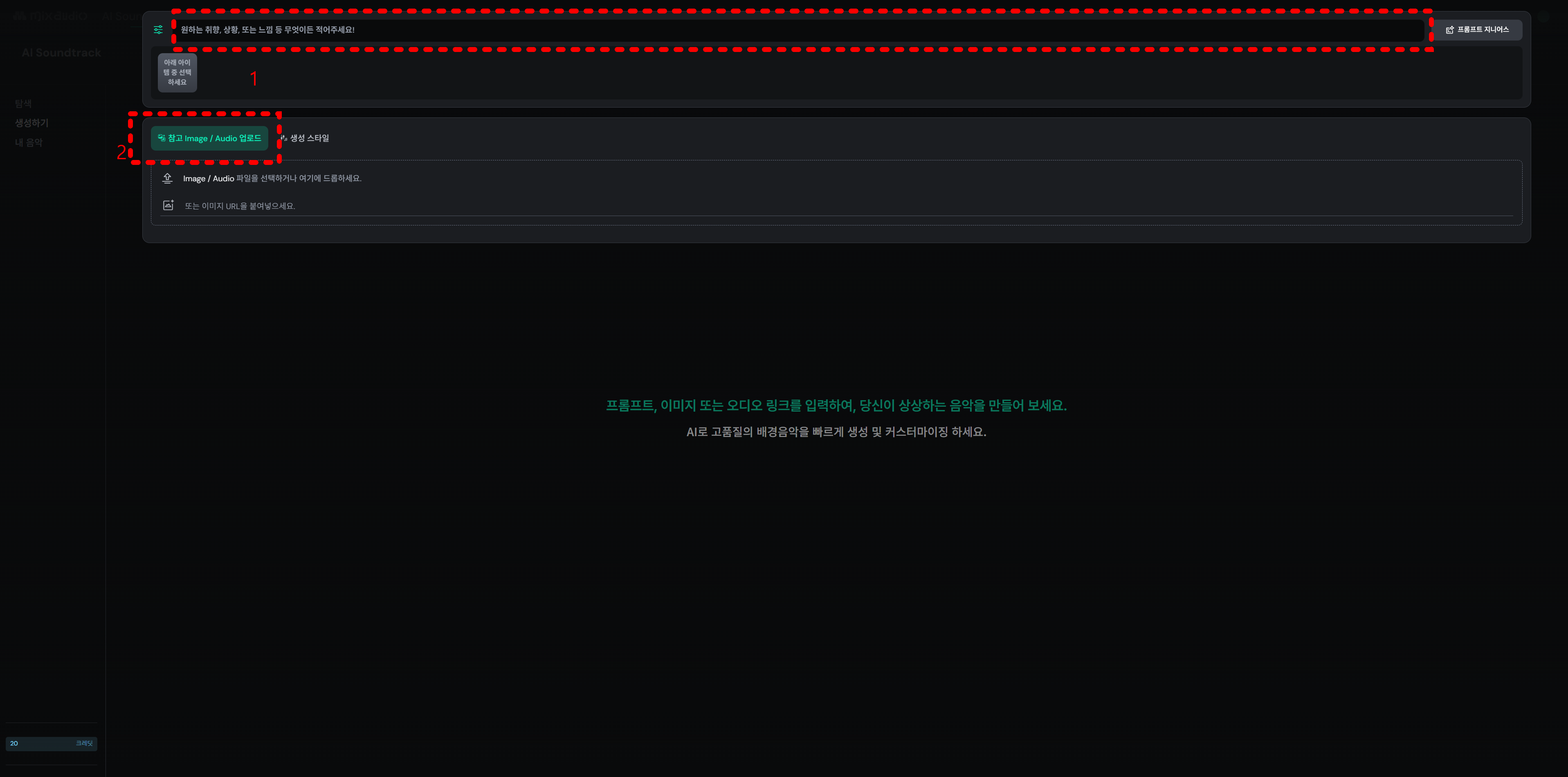 프롬프트 입력창에는 본인이 원하는 느낌이나, 음악 스타일 등을 입력하면 됩니다.