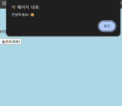 눌러보세요! 라는 버튼과 <script></script> 라는 Javscript 코드를 추가하였습니다.