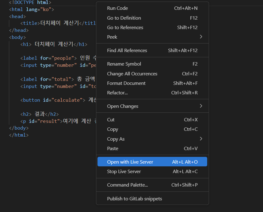 붙여넣기 한 다음 우클릭 - Open with Live Server을 클릭해줍니다.