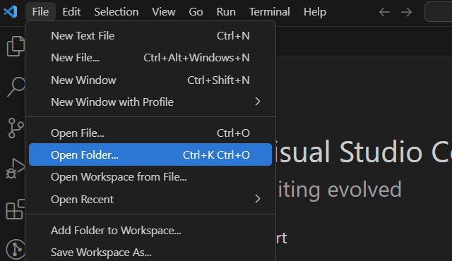 VScode를 열어서 File- Open Folder를 눌러주세요.
