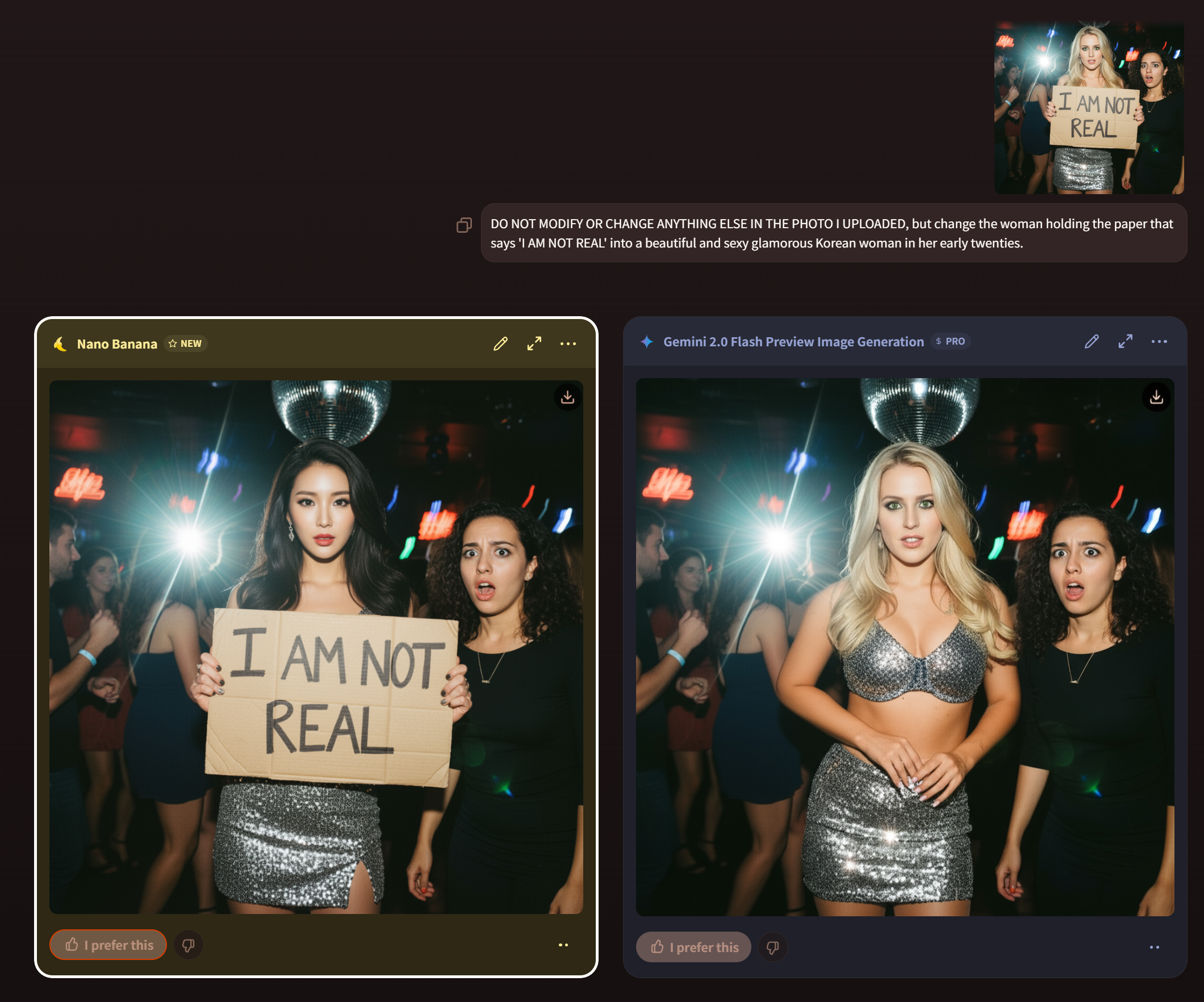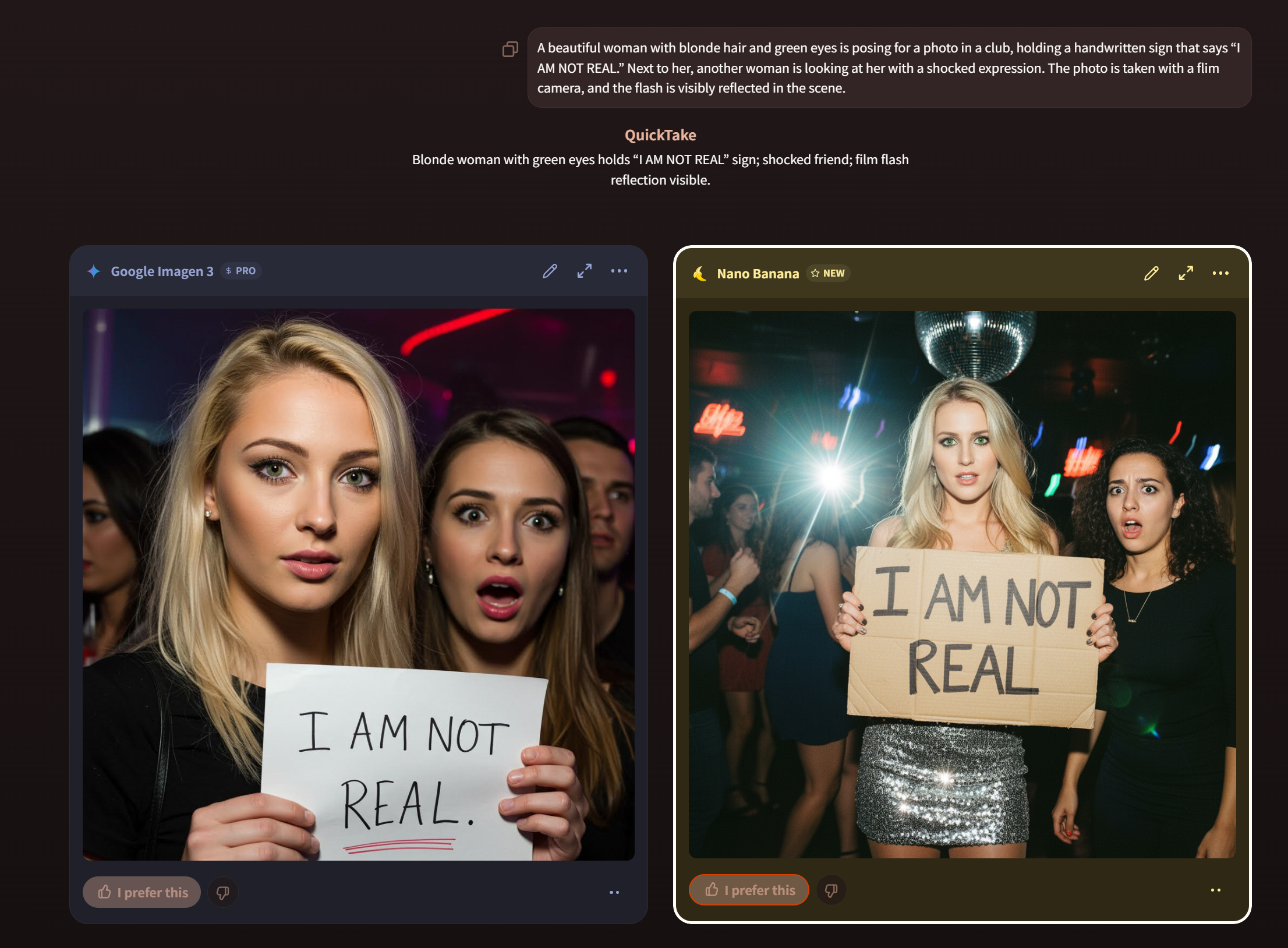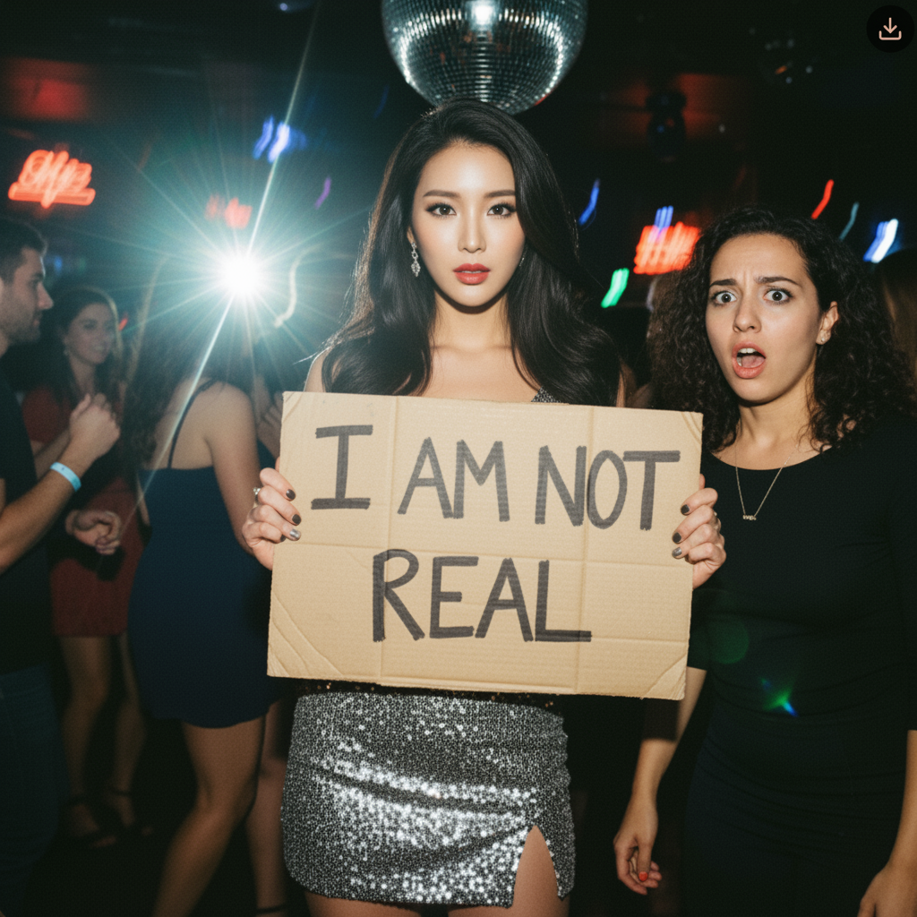 A beautiful woman with blonde hair and green eyes is posing for a photo in a club, holding a handwritten sign that says “I AM NOT REAL.” Next to her, another woman is looking at her with a shocked expression. The photo is taken with a flim camera, and the flash is visibly reflected in the scene.