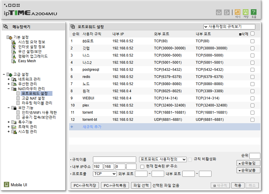 집 컴퓨터에 원격으로 붙게하기위한 설정들과 각종 나스에서 쓰이는 포트들을 포트포워딩 해두었습니다.