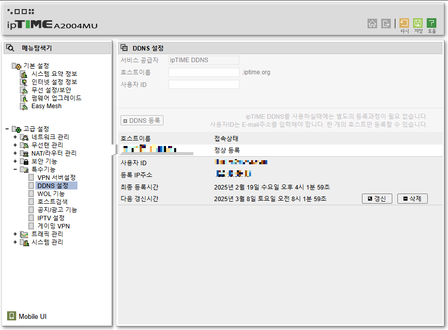 고급설정 -> 특수기능 -> DDNS설정 메뉴로 접속 및 아래와 같이 입력 후 DDNS등록을 눌러줍니다.