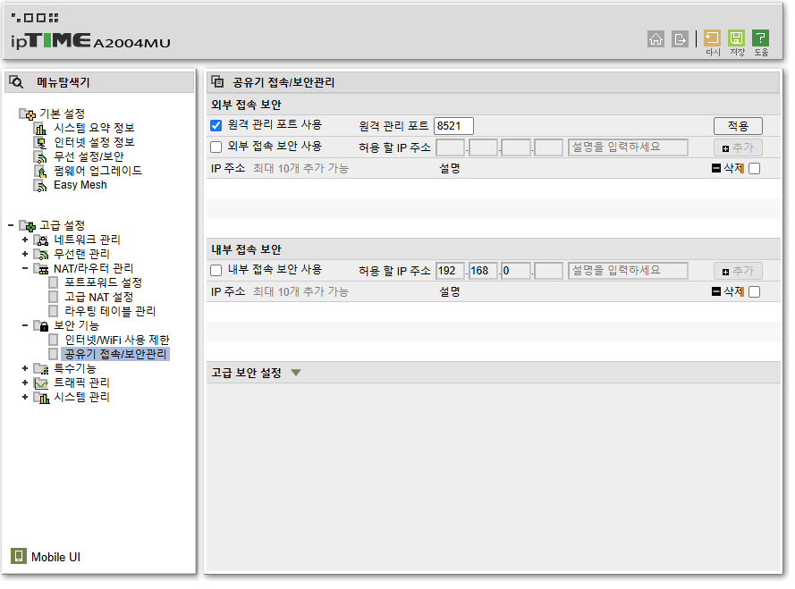 추가적으로 외부에서 공유기설정페이지에 접근하기위해서는 아래와 같이 설정해두어야합니다.
